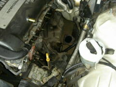 さてボンネットを開けて、タワーバーを外します(実際には向かって右側だけ外して上に跳ね上げといただけですが)