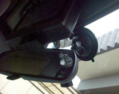 本体はルームミラー右上にかぶる、ってかんじ。