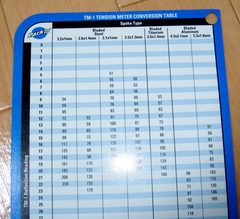 裏表に表がありますが、一番上にスポークの種類が書いてあって、左にはテンションメーターで読める数値が書いてあるので、その交差した位置に書いてあるのが実際のテンションです。