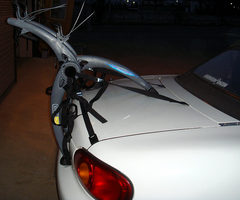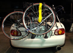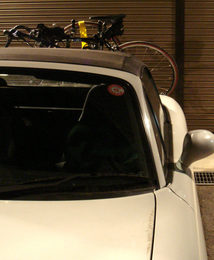 さすがにロードスターの幅ではフロントホイル外さないと車幅より出まくりで白黒の車に止められそうです。黄色い長いベルクロテープは、ボディ端から荷物が何センチだか出てるときには目印をつけないといけないというのをおぼろげに覚えているので、布旗のかわりにつけてます。ほんとは白だか赤だかをつけるんだっけか。まぁいいや。