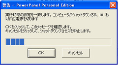 ところでCyberPowerのUPSツールは、商用電源が切れた後、設定時間経過すると、このダイアログを表示して、一応キャンセルが出来るようになってます。