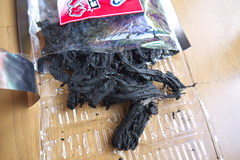 それっぽい形にしたサキイカにイカスミで色つけたようですが、手にイカスミがついてタイヘン