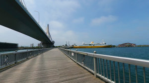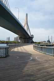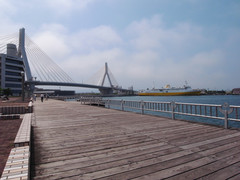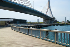 アスパムの、海側は公園というか桟橋というか遊歩道みたいになっていて、ベイブリッジの下を通って対岸まで行けるようになってるようです。