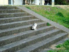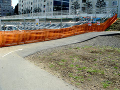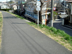 まそれはともかく、橋まで戻るのもめんどくさいので、行き止まりからちょっと戻ったところに住宅地に降りられるところがあるので階段で降りる。一応チャリ用スロープもあった。