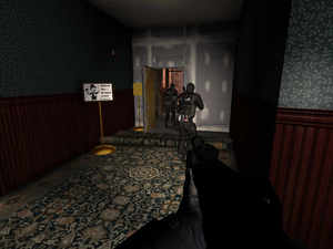 ここは7階の外周りですが、安全ネットの向こうにも足場がちゃんと組んであります。土ぼこりはヘリ(たぶんスナイパーが乗っている)が近寄ってきたために風で巻き上げられたもの。視界が悪くなって邪魔。