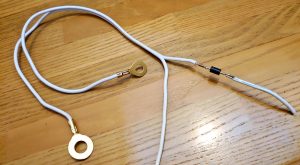 メモリー消えるとなんかめんどそうなので、適当なケーブル作る。予定では安定化電源接続する。まぁダイオードはいらないかもだけど、バッテリー側から安定化電源への逆流防止の気休め。