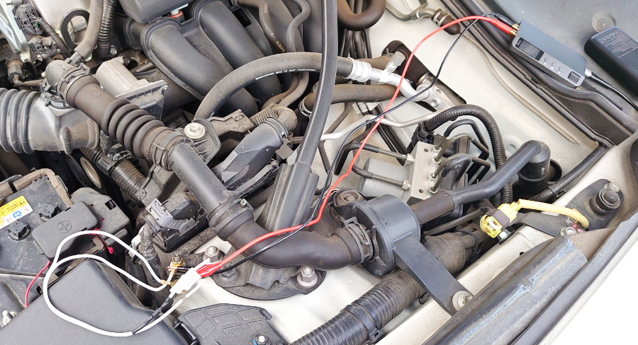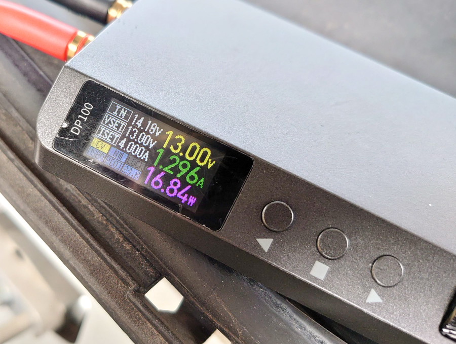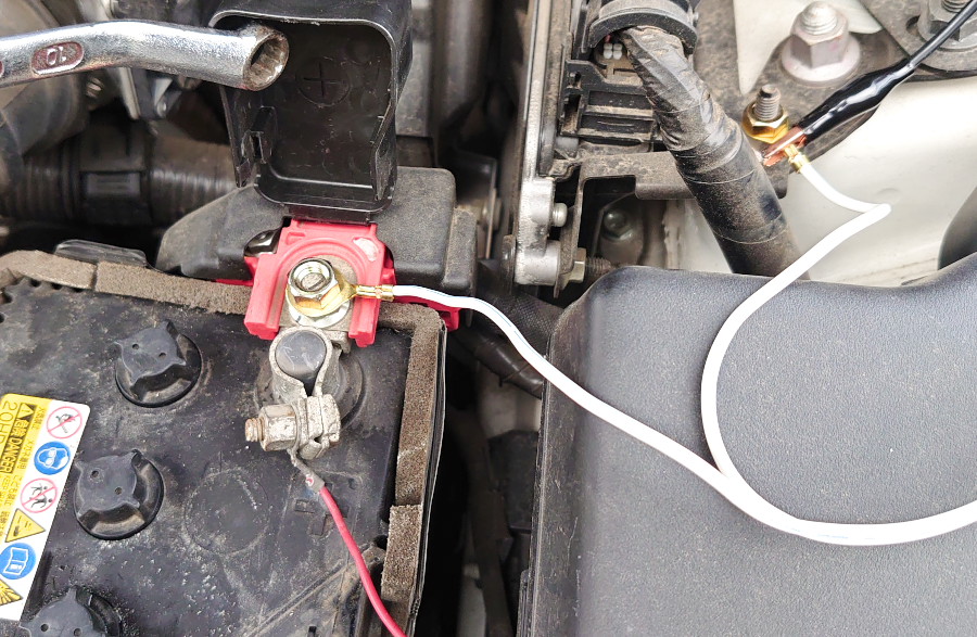 そんでバッテリー+と、ボディに接続・・結局マイナス側は電源のワニ口クリップをボディに付けた端子付近に噛ませちゃってるけども。まぁ重要なのはプラス側だしね。以前、電源のワニ口クリップをプラス端子に直接噛ませて作業してたら、バッテリー外す工程のときにクリップが外れちゃったのよね。今回は端子にネジ止めなので安心。