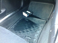 ってことで、車を止めて、足下の水をかき出し、タオルを浸して車外で絞る、ってのを20回くらいやって、走り出したところ、まぁ一応大丈夫。