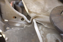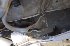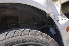 ってことで、フロントタイヤの前側にフェンダーが当たってたので、そのままでは自走出来なそうだから、ハンドルを一旦左に切って、フェンダーとの間に出来たスキマにジャッキつっこんで、そのままおまわりさんに持ってて貰って、ハンドルを右に切っていくとフェンダーがバキバキとかいって外に出たので、それを何回か繰り返したらとりあえずフェンダー内張り(ライナー)の折れたところがタイヤに当たってはいるものの、フェンダー自体はハンドル切ってもタイヤには当たらなくなったので、自走出来そうッス
