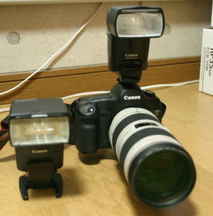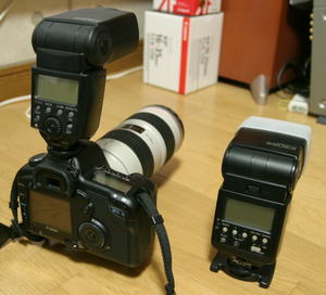 ま、ともあれ5Dに580EX、被写体の左上2mくらいのところに550EXを設置して各々ON/OFFで比較してみました。以降、カメラに装着してある580EXがマスター、550EXはスレーブ。です。