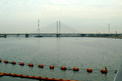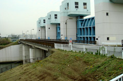 ほんとは外環の下をくぐってきたかったのですが、そろそろ日没が近づいていて家に帰るまでに暗くなってしまいそうだったので、その前の橋を渡ることに。橋の上から外環を見る。ていうか水いっぱいあるなー。
