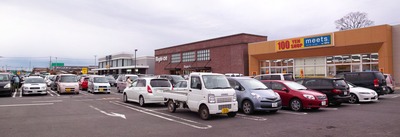 この位置から、自分より背中側にはベイシア(食品関係)とベイシア電気があって、目の前には100円ショップとライトオンとツタヤ、その向こうにカインズ、オートアールズがあります。