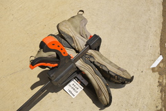 なんてことしていたら作業靴のソールがはがれたので、パンドー塗ってクランプで挟んで数時間放置