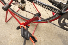 ということで、スタンドにチェーン用ブラシをクランプでくくりつけて
