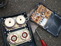 そーいえばカーステのかんたんウーファーが、またベコベコいうので、見るとコーン(プラスチック板だけど)とエッジの接着がはがれている部分があるので、また接着するか・・前回はセメダインSUだったので、今回はエポキシ2液でつけてみた。