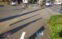 コレって、この国道の、左側の車線側の歩道だから、チャリンコはこの写真の向きに走る事しか基本的には無いはずなのに、なんでこの道路のプリントは逆向いてるの?
