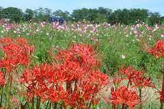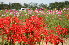 コスモスの近くに彼岸花があったのでコスモスを背負わせて撮ってみる。