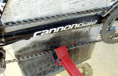 チェーンクリーナーを引っ掛けて、ゴシゴシやって、またクリーナーを引っ掛けて汚れを流して、ちょっとクランクを回してチェーンを送って次の部分を掃除。の繰り返し。