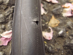 バーストのイキオイで空いたくさい。どーも経年劣化っぽいのでタイヤ交換しないとなー。451サイズはほんと選択肢少ないのでどうしたもんか・・