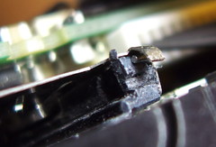 一応元あったであろう場所へ戻してみるも、おそらくは穴であったであろう部分が欠けてしまっていて、SDを押し込んだときにスライドするガイドと一緒にコの字状のパーツも奥に動いていってしまいます。