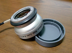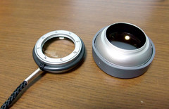 ワイコンのほーは、装着するとこんな。鉄のリングをカメラのレンズの前部に両面テープでくっつけて、そこに磁石でくっつけるタイプ。