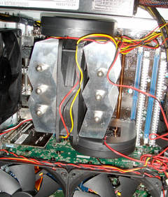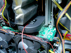 そんでもってなんだかブロアが気に入ったので、このマザーの、CPUスロットの横についてる、サウスブリッジの出張ヒートシンク(ヒートパイプでつながってて、VRMにくっついてる)にも付けることに。