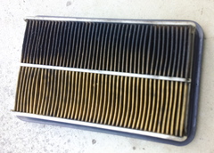 ブレーキクリーナー吹いて、エアで吹いて、の繰り返し。かなり黒いのが無くなる・・・ていうかなんとなくこのエレメントは湿式のような気もするので、オイル流しちゃっていいかはビミョウなとこだけど、まぁ真っ黒でホコリが詰まってるよりはよかろうもん