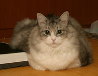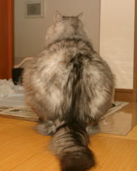 体重計に。なにかしらに片腕乗せるのが好きですな。扇風機の土台とか。