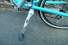 サイクルベースあさひオリジナルセンタースタンド。ロードバイクにはスタンドはどうかっつー意見もあるけど、ミニベロはまぁシャレで乗る感じなのでいいかな。と。