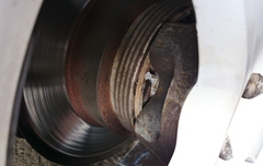 で、前進方向へタイヤを回してブレーキかけてもあまり強くないけど、後進方向だとかなり効く。やっぱりアームがヘニョいので、アームが押される方向だと開いちゃって、引っ張られる方向だと閉まっていく感じ。