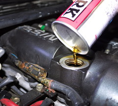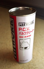 日産で売ってるPCVバルブクリーナーです。オイル交換して、冷えた状態でコレ入れて、何分かアイドリングして暖まるとスラッジとかを落としてくれるという。
