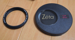 このレンズにマクロリングライトを取り付けるためのアダプター(ステップダウンリングみたいなもの)と、KenkoのZETAのC-PL 67mm