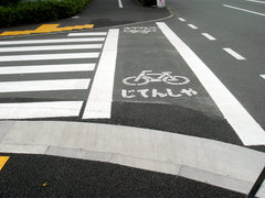 よくこういうプリントがしてあるじゃんか。これってどう見ても歩道から伸びてるのよねこのじてんしゃゾーンは。なのに歩道は法令違反。で、こういうのを見ると自転車は歩道を走るものだとか思っちゃうと、車道を走ってる自転車を邪魔と思うのもむべなるかな、なので、一概に自転車を邪魔者扱いする自動車が悪いかというとそうでも無くて、こういう中途半端な状態にする行政の責任だと思うのよね。