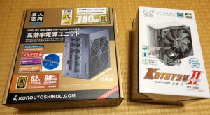 ファンと電源。クロシコだけど、フルプラグインで80GOLDと、ちょっとよさめの買ってみた。でもクロシコなので1万もしない。おねうち。