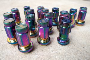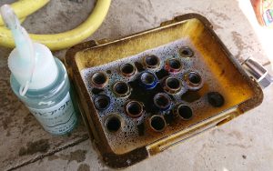 ついでに、レーシングナットのサビ、というかブレーキダストが付着してサビたモノ、をキレイにするため、サビアウトを溶かした水にナットを漬け込んでみる