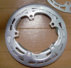 ので、なんとかしたいなぁ。と思っていて、実はキャノンデールR800についてる105のコンパクトクランクのチェーンリングが50Tで、それを付けてみようとずっと思ってたんですけど、チェーンカバーが無いと、ズボンの汚れはまぁ裾バンドで回避するにしても、折りたたんだときにチェーンが外れるのですよ。