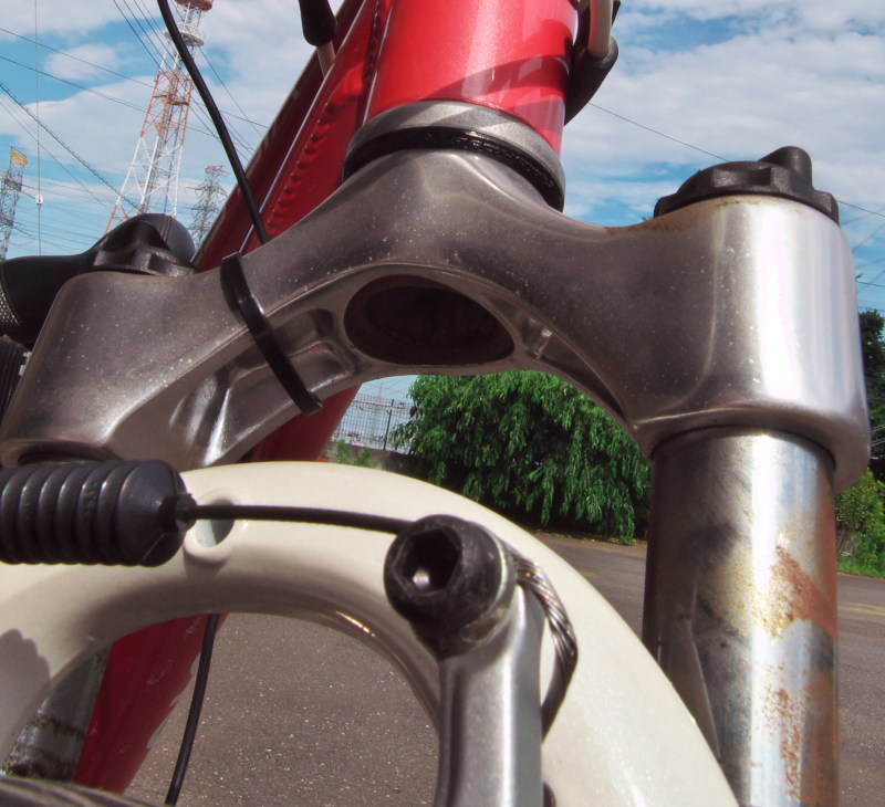 もちろんこのチャリではショックが沈むとハンドルバーとの距離が変わるので、こんなところに取り付けるとカゴがハネちゃうのは目に見えてるので付けませんけど、クロスバイクとかだとこのあたりに開いてる穴に取り付けますよ、ってことで。