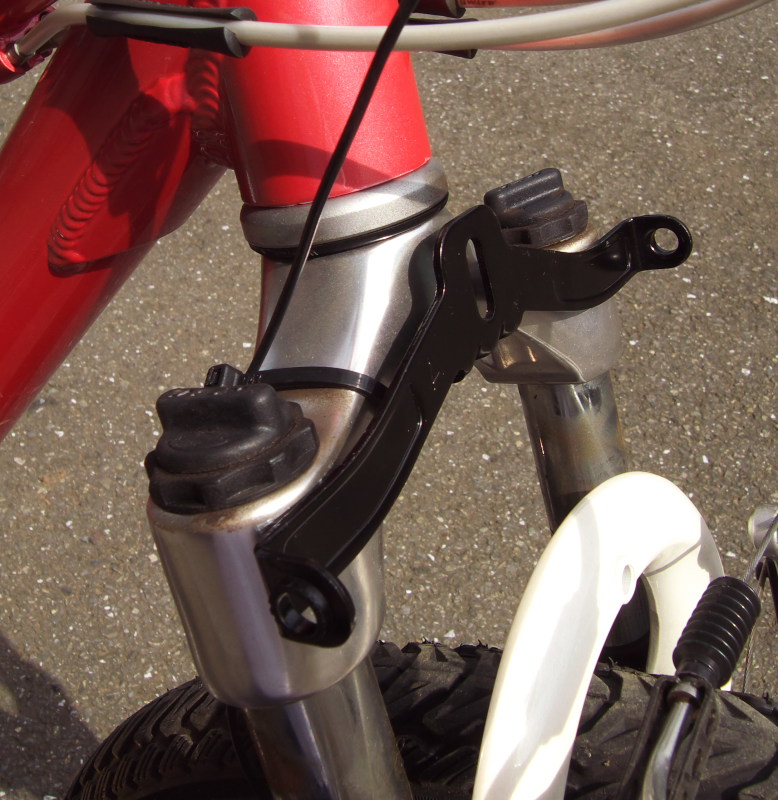 今回チャリのような、フロントショックが無いクロスバイクなどは、キャリパーブレーキ取り付け用の穴か、泥よけ取り付け用のダボ穴にこのパーツを取り付けたりします。