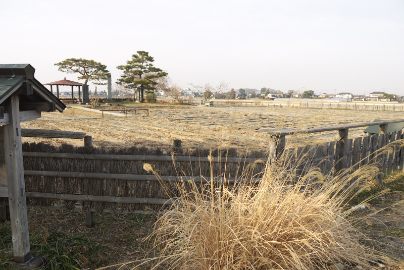 立て札(?)が2個あって、この門が旗本屋敷の裏門で、市に寄贈されたので使ってみた。とか、萩の柵は買うと高いけど地域の水路のところに生えてるの使ってるから安上がり。みたいなことが書いてある