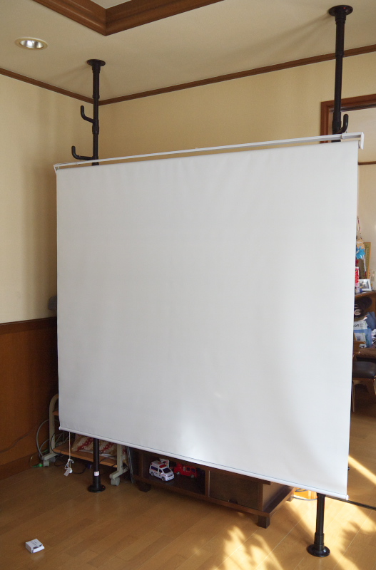 ただやっぱりちゃんとしたスクリーンに比べると薄いので平面性が確保できなくて、ハジのほうが少し曲がったりします。まぁあまり気になりませんけど。あと、軽いのでエアコンの風とかでふらふら動くので、風の来ないところに設置する必要ありね。