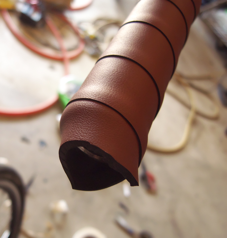 うんと厚手のソフトバーテープとかだと端を切っちゃったりするけど、今回はそこまで厚くないのでバーエンドと一緒に巻き込む感じで