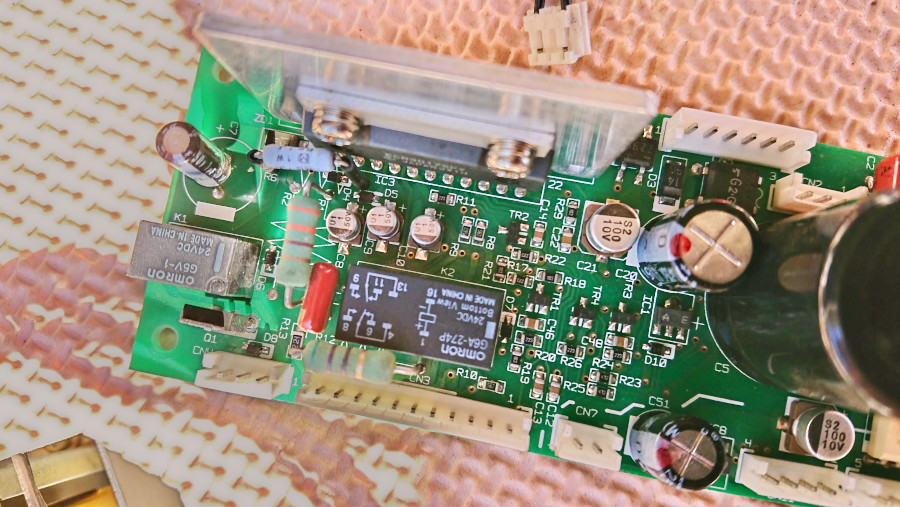 こんなバラックな状態にしといて、リレー周辺のコンデンサに温風あてつつリモコンON/OFFすると、動作する。