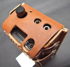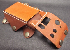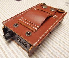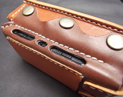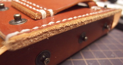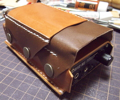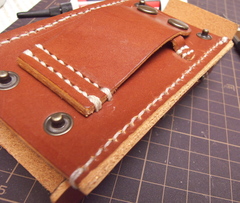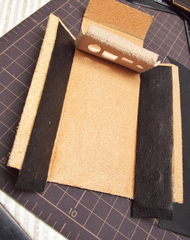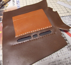 ウォークマンをセットする方法をさんざん考えたのですが、革のみでぴっちぴちに作ると出し入れがタイヘンそうだし、ゆるく作ってガタガタもいやなんで、裏側は合皮を使ってみることに。