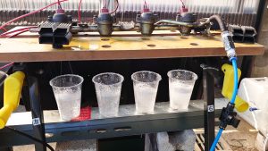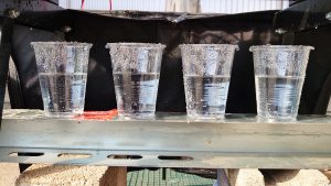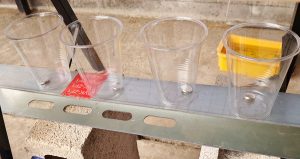 吹き出し量と形を見たいので、とりあえずワークベンチ下にカップを置く。倒れないように中にネオジム磁石転がしとく