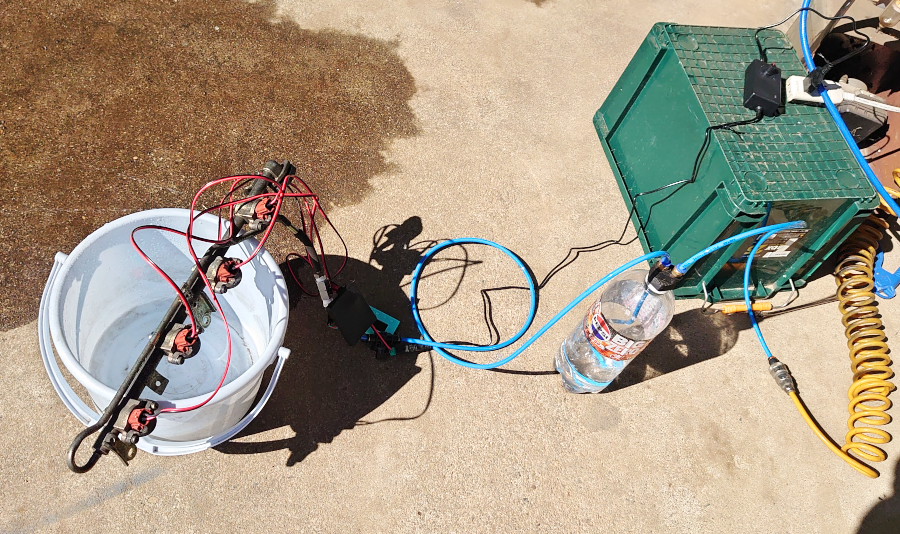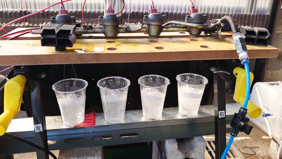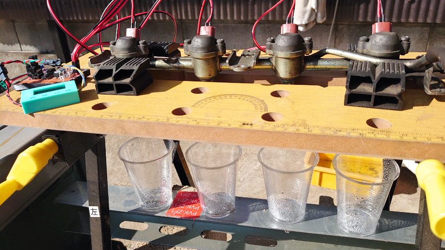 そんでワークベンチの上にデリバリーパイプ置いて、去年の夏頃作ったインジェクタカチカチするやつで噴射テスト