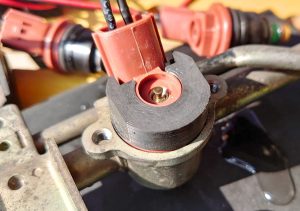 んで4番を外して、噴射のテストしてみると、あれ全然問題ないな(^^; これインジェクタじゃなかったかな。とりあえず交換はするけども。と思ってエンジンルームに近づくとガソリン臭い。見たら4番のインテークの中にガソリンがなみなみと、というか溢れてた