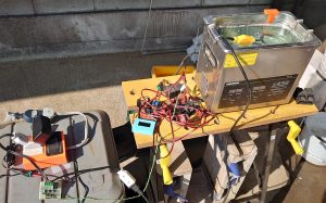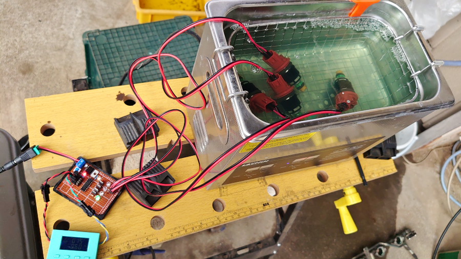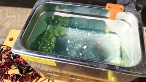 その後超音波洗浄。インジェクタはカチカチ動かしたまま。45分の洗浄を2セット+1時間放置くらい。一晩放置でもいいくらいかなとは思うけども。