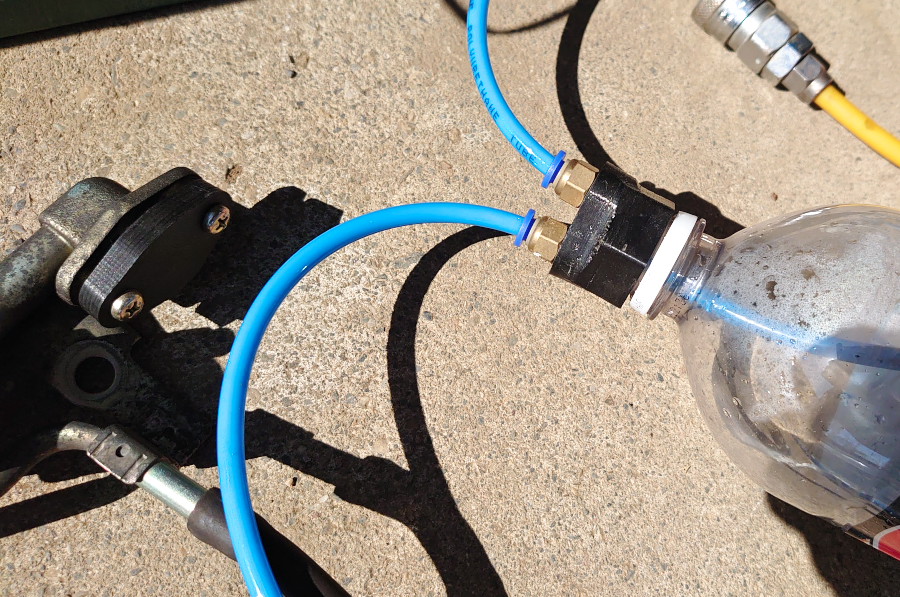 ペットボトルにエアー入れると水が出るようにしたキャップから燃ポン側へ接続して水を圧送した